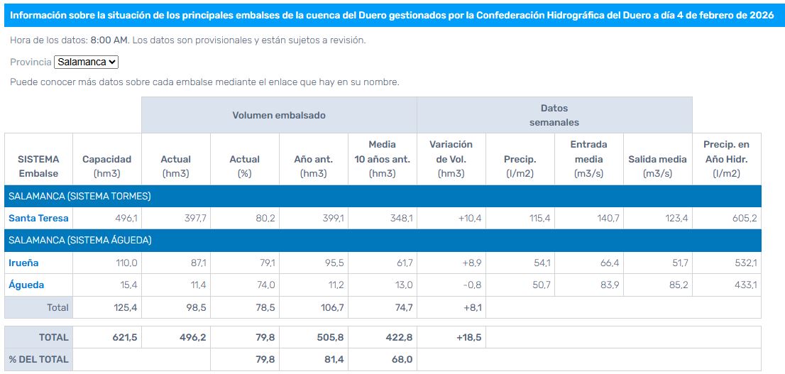 Datos del agua embalsada en Salamanca, este miércoles, a las 8 a.m. (Fuente: CHD)