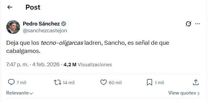 - Pedro Sánchez: Respondió a las críticas con una cita quijotesca en la red X: «Deja que los tecno-oligarcas ladren, Sancho, es señal de que cabalgamos».