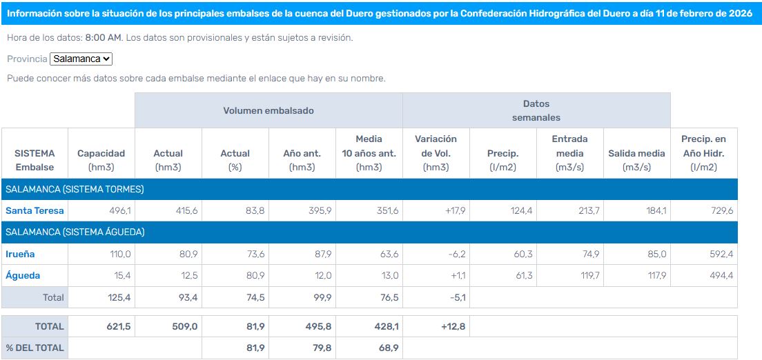 No llega a alcanzar el nivel de «aviso», como en otras tres presas de Castilla y León), que están en «aviso hidrológico rojo», achicando agua en volúmenes ingentes en proporción a su capacidad, como el embalse de Cuerda del Pozo (Soria), en el río Duero, el de Las Vencías (Segovia), en el río Duratón y el de Villameca (León), en el río Tuerto, que juntos no desaguan lo que está desembalsando Santa Teresa, pero son infraestructuras distintas.