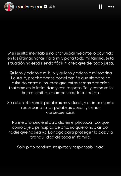 Mar Flores pide responsabilidad a ambas partes. «Me resulta inevitable no pronunciarme ante lo ocurrido en las últimas horas. Para mí y para toda mi familia, esta situación no está siendo fácil, ni creo que del todo justa», escribe la empresaria.