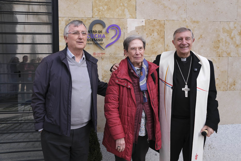 La inauguración y bendición del centro se ha celebrado en la plazoleta exterior del edificio, situado en la Carretera de la Fregeneda, 32, junto a la parroquia de la Santísima Trinidad (iglesia vieja de El Arrabal), y ha estado presidida por el obispo de Salamanca. Durante el acto se ha descubierto la placa con el nombre de este recurso diocesano, que desde hoy pasa a denominarse Centro de Escucha Diocesano ‘Carmen Calzada’, en reconocimiento a quien durante los últimos 26 años ha sido directora de Cáritas Diocesana de Salamanca y que, desde sus inicios como trabajadora social en la entidad en la década de los 70, ha entregado su vida al servicio de la Iglesia de Salamanca y de los más vulnerables. Carmen Calzada, presente en el acto, se ha mostrado profundamente sorprendida y emocionada por este gesto de gratitud hacia su trayectoria y entrega.