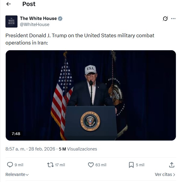 Trump se ha dirigido en su mensaje a la población civil de Irán diciéndole que «la hora de vuestra libertad está al alcance de vuestras manos. Refugiaos y no salgáis de casa; las bombas caerán por todas partes. Cuando terminemos, tomad el Gobierno. Es vuestro».
