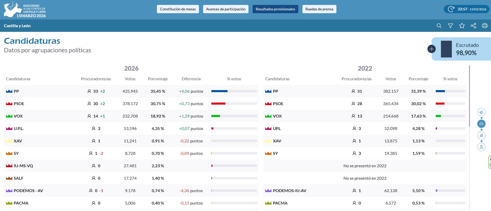 El PP obtiene 33 procuradores (2 más que en 2022) mientras que el PSOE logra 30 procuradores (2 más que en los últimos comicios), mientras que Vox se queda con 14, solo uno más que hace cuatro años, cuando algunas encuestas llegaban a otorgarle 18 en la campaña. UPL repite con 3 procuradores, XÁvila también revalida su escaño y Soria Ya se queda con 1 tras perder dos.