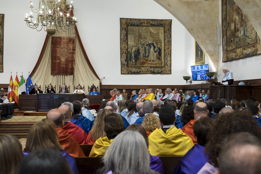 “Europa no es únicamente una construcción institucional ni un mercado común: es una conversación milenaria sostenida por universidades, lenguas, tradiciones intelectuales y memorias compartidas. Las universidades europeas han sido, durante siglos, los lugares donde esa conversación se ha mantenido viva incluso en los momentos más difíciles de nuestra historia. Cuando esa conversación se interrumpe, Europa se debilita. Cuando continúa, Europa renace. Hoy, en este Paraninfo, y ante la presencia de las dos máximas autoridades del Reino de España y de la República Italiana, Salamanca continúa esa conversación entre España e Italia”, apostilló el rector ante los cerca de 180 doctores revestidos que llenaron el Paraninfo junto a autoridades académicas, civiles, militares y religiosas. Entre ellas, el presidente de Castilla y León, Alfonso Fernández Mañueco; la ministra para la Transición Ecológica y el Reto Demográfico, Sara Aagesen; el embajador de Italia en España, Miguel Fernández-Palacios; el presidente de las Cortes de CyL, Carlos Pollán; el delegado del Gobierno en Castilla y León, Nicanor Sen; el alcalde de Salamanca, Carlos García Carbayo; y los rectores de las universidades de la Pontificia de Salamanca, Santiago García-Jalón, y Perugia, Valerio Decesaris; y la vicerrectora de Profesorado, Rosario Arévalo.