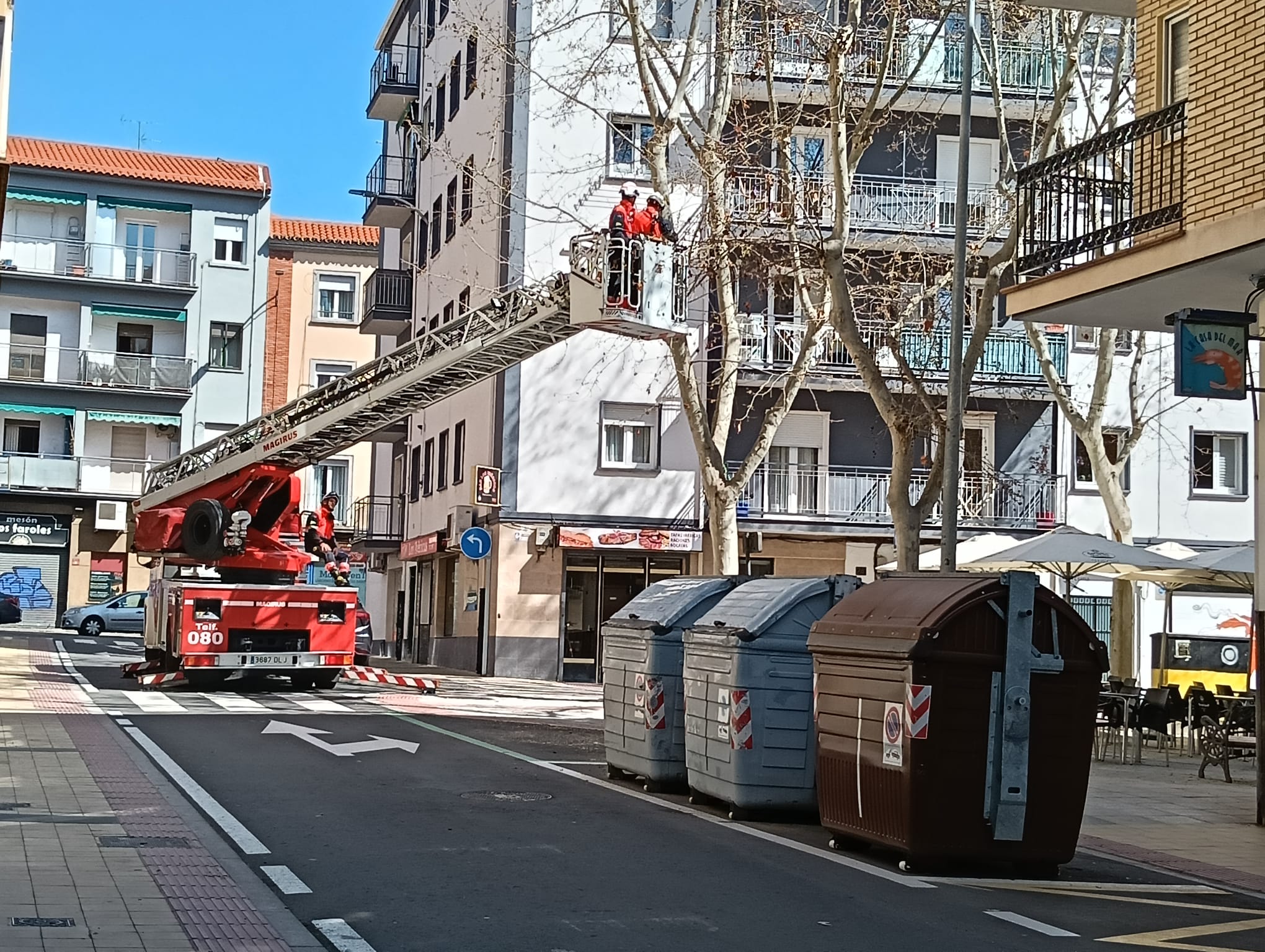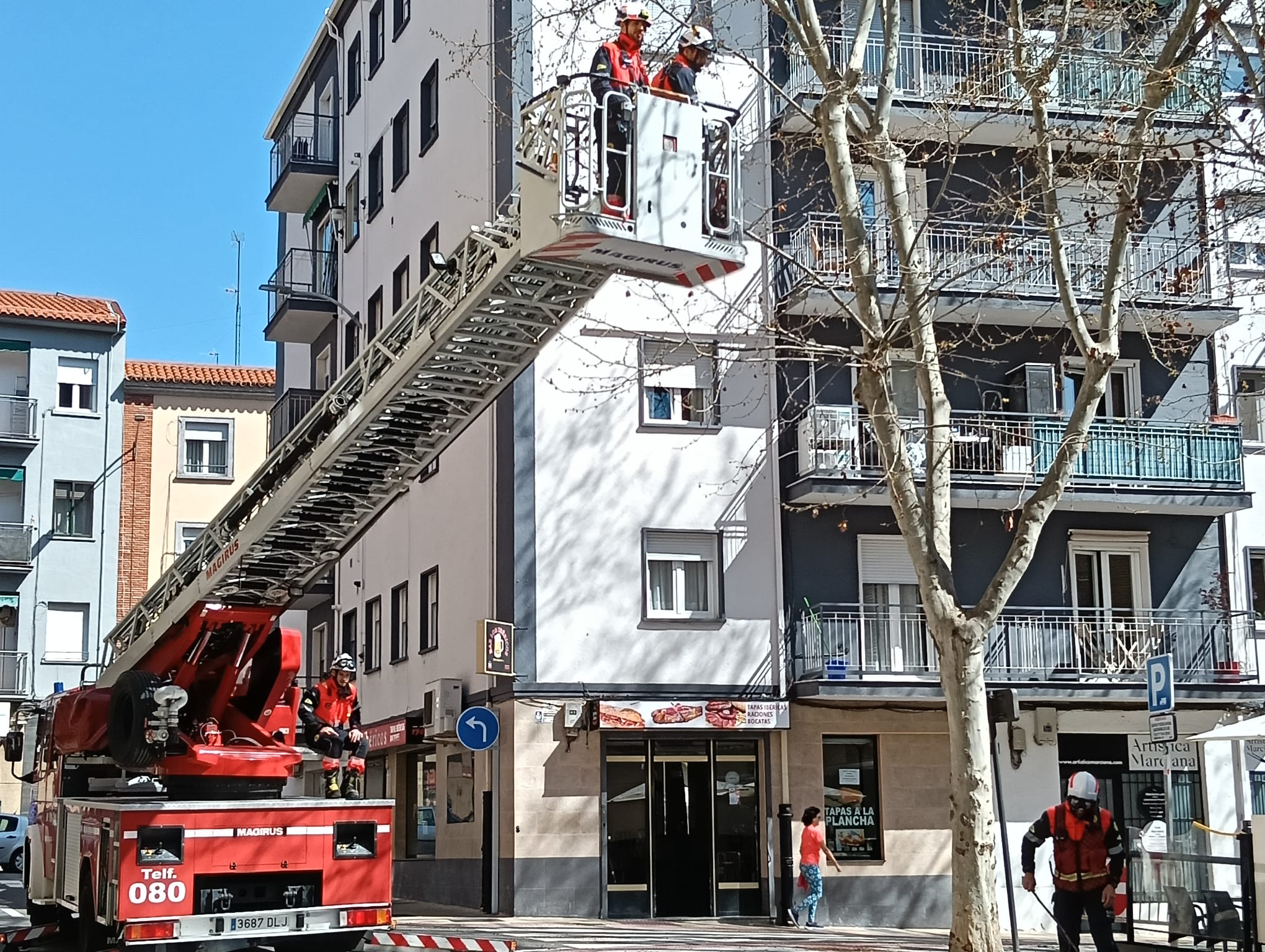 Una dotación de Bomberos de Salamanca acudió a la calle Toledo esquina con Velázquez, justo donde se asienta una pequeña plazoleta con árboles, para limpiar uno de los ejemplares.