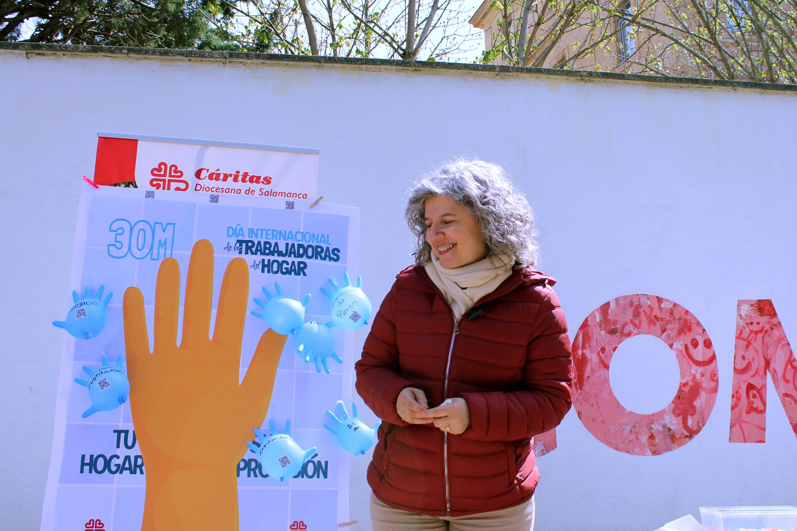 Cáritas Diocesana de Salamanca se ha sumado este jueves a la campaña autonómica de Cáritas Castilla y León con motivo del Día Internacional de las Trabajadoras del Hogar, que se conmemora cada 30 de marzo. Con el lema “Tu hogar, su profesión”, la entidad ha desarrollado una actividad de sensibilización y reivindicación frente al mural “tu compromiso mejora el mundo” que adorna la entrada del centro.