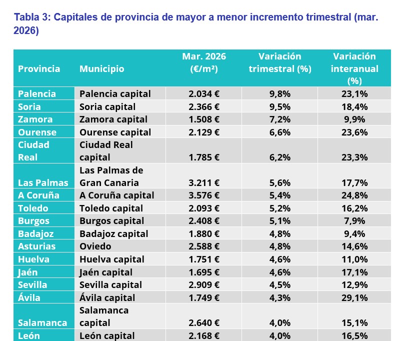 En el caso de la capital salmantina, el precio medio de la vivienda alcanzó los 2.640 euros por metro cuadrado, tras registrar una subida trimestral del 4% y un incremento interanual del 15,1%, lo que sitúa a Salamanca entre las capitales de provincia con mayores subidas en el inicio del año.