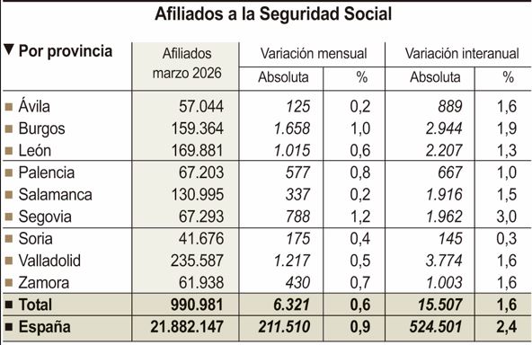 Por su parte, el número medio de afiliados a la Seguridad Social se situó en Castilla y León en marzo en 990.981 personas, lo que supone 6.321 más que en enero, con un incremento porcentual del 0,64 por ciento, una tasa inferior al 0,98 por ciento del conjunto de España, hasta los 21.882.147.
