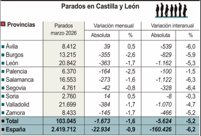 El desempleo en Castilla y León descendió en marzo un 1,6 por ciento al registrar una bajada de 1.673 personas con respecto al mes precedente, hasta totalizar 103.045 parados, lo que sitúa a la Comunidad como la cuarto que más bajó en datos absolutos, por detrás de Andalucía (8.836), Cataluña (3.777) y Valencia (2.467).