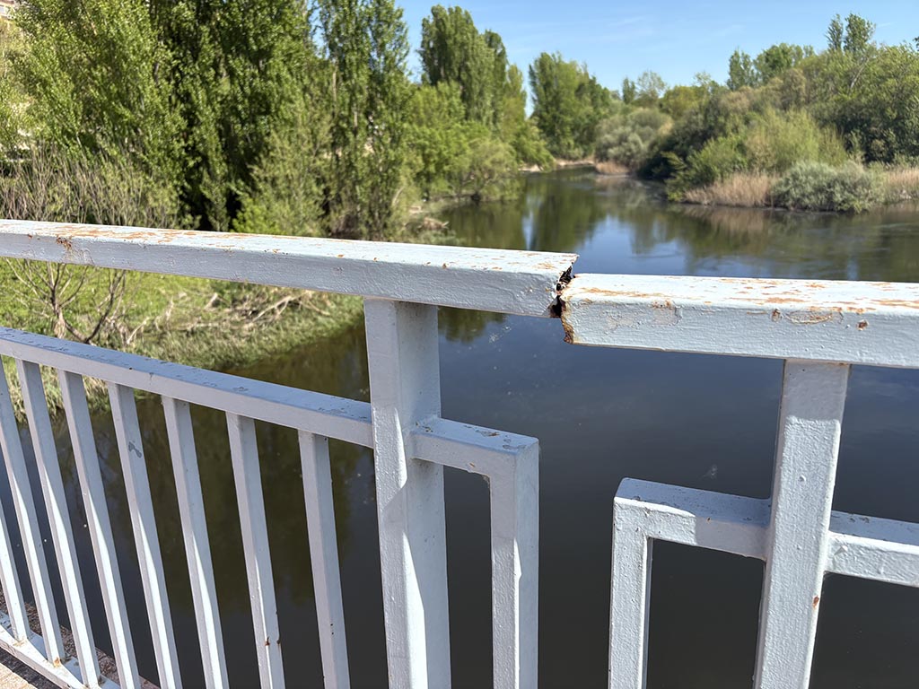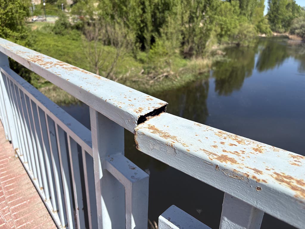 Una de las barandillas está abierta en canal, porque está rota, pero nada la sujeta al suelo del propio puente, con lo que conlleva un peligro para los peatones que se apoyen en la barandilla.