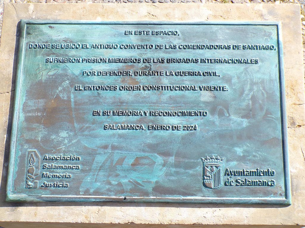 Ahora, la placa ubicada en los jardines de la Ronda de Sancti Spiritus vuelve a lucir como cuando se colocó el 3 de febrero de 2023, donde se recordó que Salamanca honró la memoria de los brigadistas internacionales con este monolito y la placa en el solar del convento de las Madres Comendadoras de Santiago. Fueron encarcelados en las dos prisiones que había en Salamanca allá por los años treinta del siglo pasado, la de Prisión Provincial y la del Convento de las Comendadoras de Santiago.