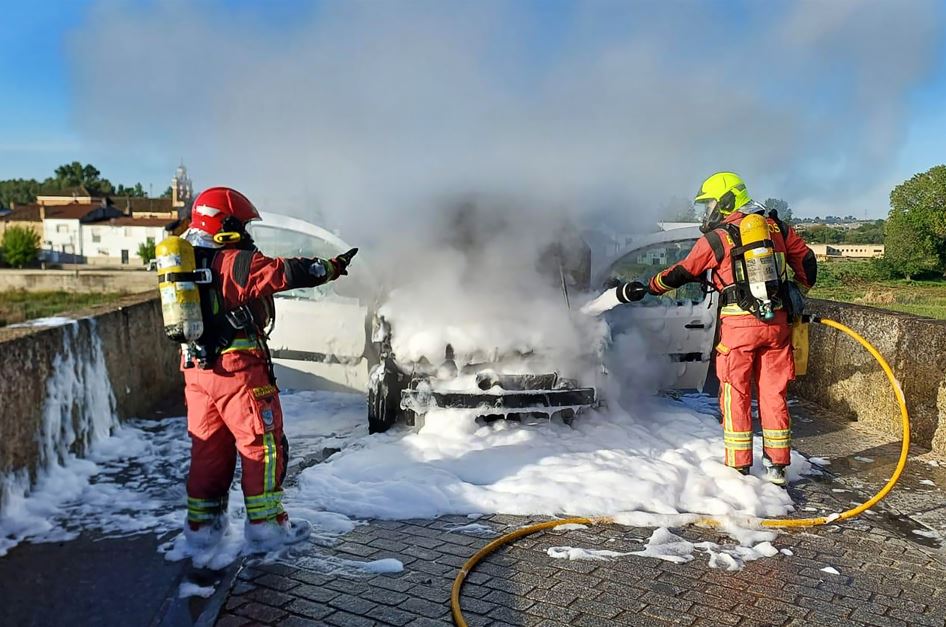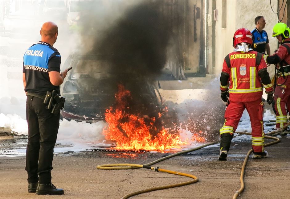 Según informó el Servicio de Emergencias 1-1-2 de Castilla y León, un turismo se vio envuelto en llamas sobre las 11.05 horas en la calle José María del Hierro, hasta donde tuvieron que desplazarse efectivos de los Bomberos de la Diputación de Salamanca, la Guardia Civil y la Policía Local de Ciudad Rodrigo.