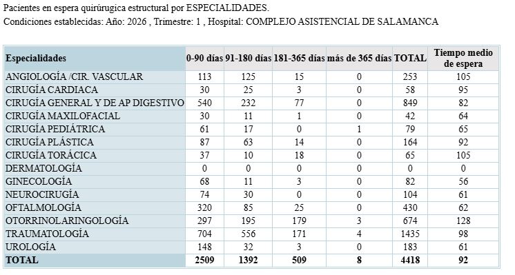 Salamanca contaba el pasado 31 de marzo con 140 pacientes prioridad uno (cuyo tratamiento quirúrgico, siendo programable, no admite una demora superior a 30 días), con una demora media de 11 días para operarse. Son 32 pacientes menos y una demora media un día inferior a la del mismo trimestre de 2025.
