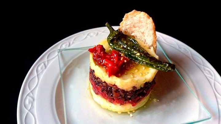 Ayudándonos de un cilindro de unos tres centímetros de alto y cinco de diámetro, lo situamos en un plato e introducimos una capita de crema de patata, la compactamos bien y sobre ella, ponemos una capa de crema de pimientos, añadimos la morcilla de Burgos y cerramos con crema de patata. Compactamos todo bien y desmoldamos.
