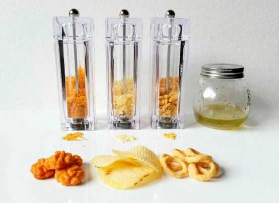 Trituramos los aros de maíz sabor barbacoa y los introducimos en un salero.