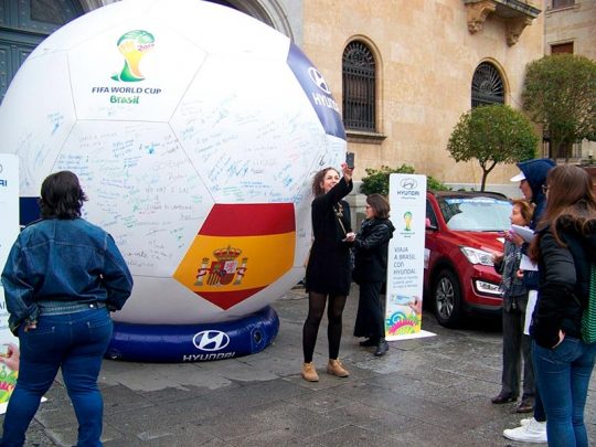 Un balón gigante colocado en la plaza de Los Bandos y muchos salmantinos que ‘vivieron’ por unos instantes la posibilidad de ‘disfrutar’ de la Copa del Mundo de Selecciones, o lo que es lo mismo, el Mundial de Fútbol que se disputa en Brasil.