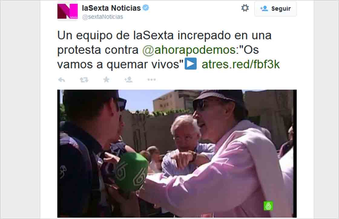 A un reportero le rompieron la cámara de fotos y un equipo de La Sexta fue increpado y zarandeado. «Iros de aquí cuatreros», «vivos os vamos a quemar» e «hijos de puta», son algunos de los gritos que los manifestantes han dirigido a estos.