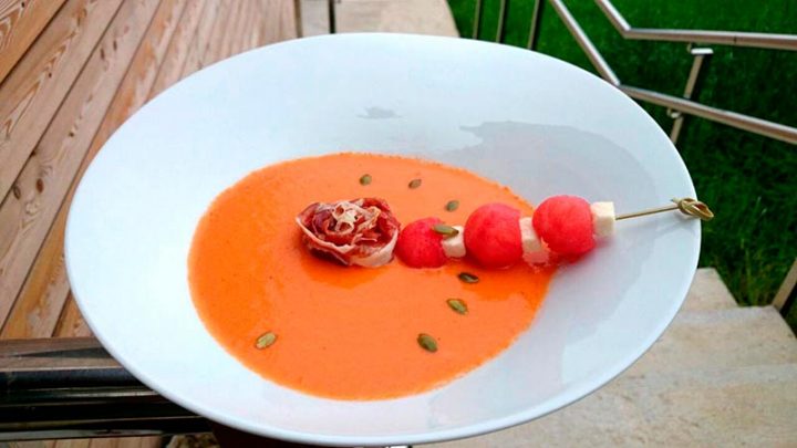 Servimos en los platos y a modo de decoración realizamos unas brochetas. Para ello, cogemos tres bolas de sandía, que previamente habíamos reservado, y las alternamos con dados de coco deshidratado.