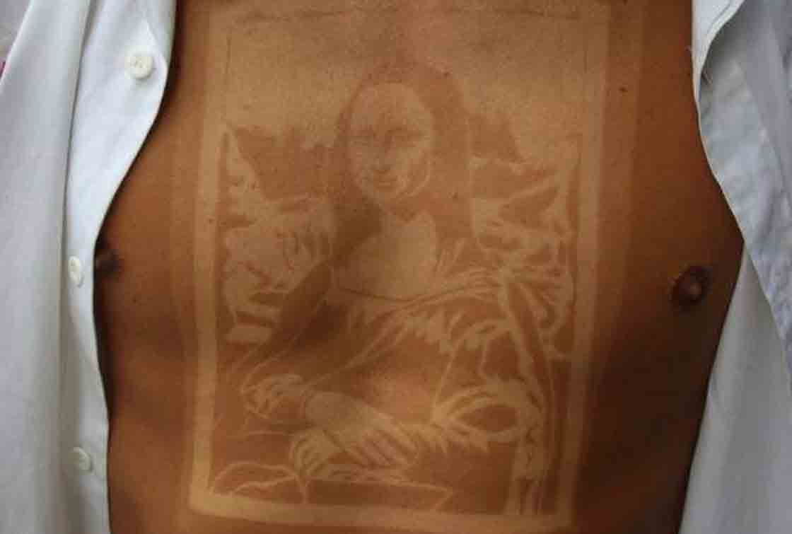 Esta tendencia consiste en tomar el sol con una plantilla o molde del dibujo que se quiere tatuar para quemar el resto de la piel y quede sin broncear la parte que cubre el molde y que resaltará posteriormente, o bien al contrario, cubrir toda la piel excepto la parte que queda expuesta al sol y que al quemarse resaltará formando un dibujo.