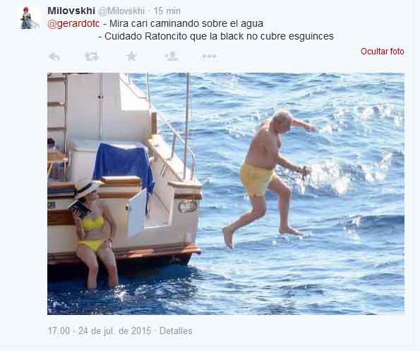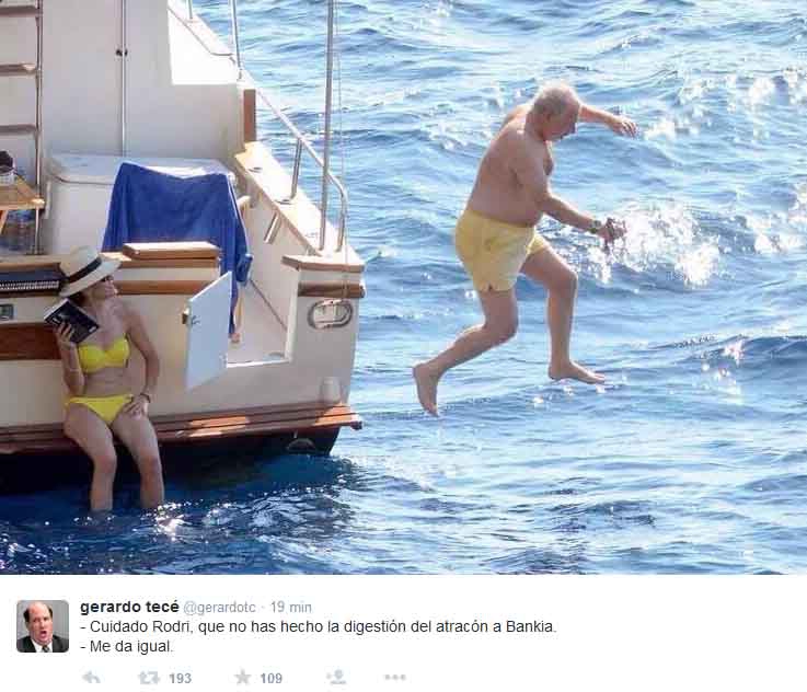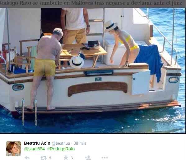El baño que el exministro y exbanquero Rodrigo Rato se dio durante sus vacaciones en Palma de Mallorca ha alegrado el día a numerosos internautas, que han hecho sus bromas de rigor aprovechando las imágenes difundidas por diversos medios.