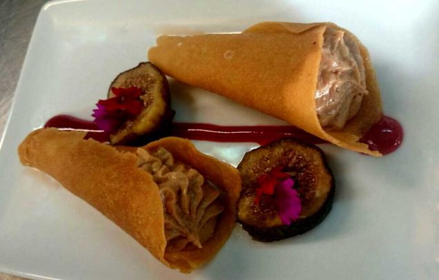 Decoramos cada plato con un hilo fino de culis de frambuesa, sobre él colocamos dos canutillos y a los lados los higos salteados.