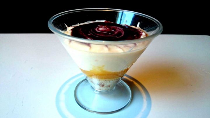 Una vez que tengamos todos los preparados fríos. Comenzamos colocando en cada recipiente -copa, tazón, vaso, étc- una cucharada de bizcocho borracho en el fondo y aplastamos. Seguidamente una cucharada colmada de las nectarinas trituradas; por encima la crema de mascarpone hasta rellenar el recipiente y terminamos decorando con la mermelada de mora.