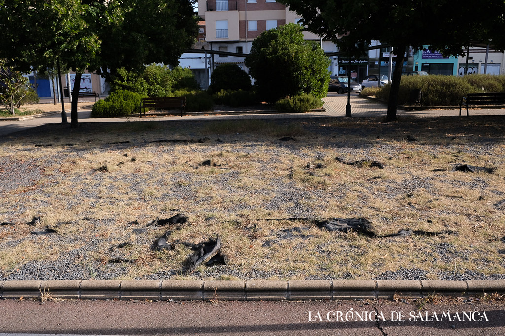 Los jardines y las zonas verdes de los barrios de Salamanca no lucen lozanos, por la hierba tostada, las fuentes rotas, los bancos deteriorados, caminos de tierra sin mantenimiento… Pero, es que el Casco Histórico con cables colgando, señales por doquier, comedores al aire libre y reformas ‘dolorosas’ para los monumentos tampoco salen bien parados